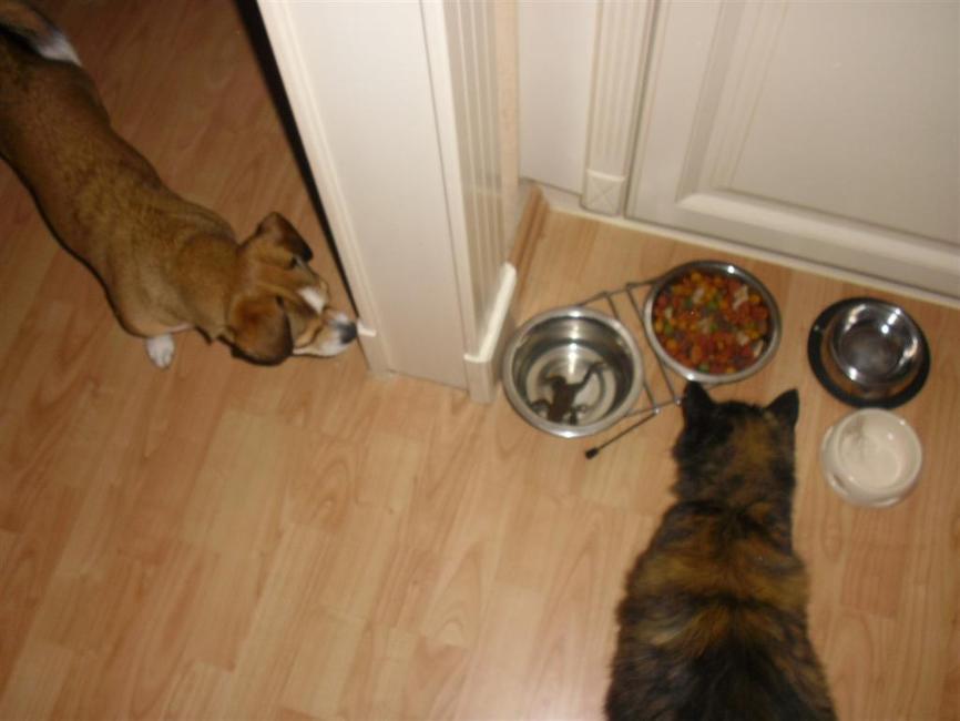 Honden foto's > Natascha > Kom je bij je waterbak zit er een kikker in!!! Chica en Mimmie zijn onder de indruk.