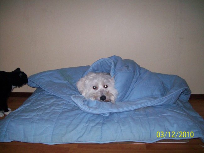 Honden foto's > Bernadet- Dhani-Shasta. > hij had het zo koud. brrrr dat ik hem in een deken heb gelegt
