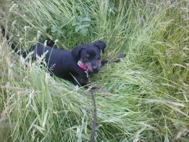 Honden foto's > Rhianne + Falkor & Joy > Joy verstoppen en etend in 't gras
