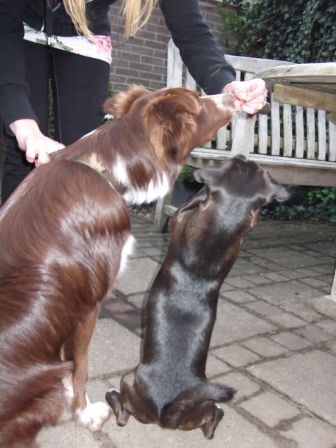 Honden foto's > Bernadet- Dhani-Shasta. > Jippie mooi zit. En shasta die het snoepje wel wil aan nemen :P