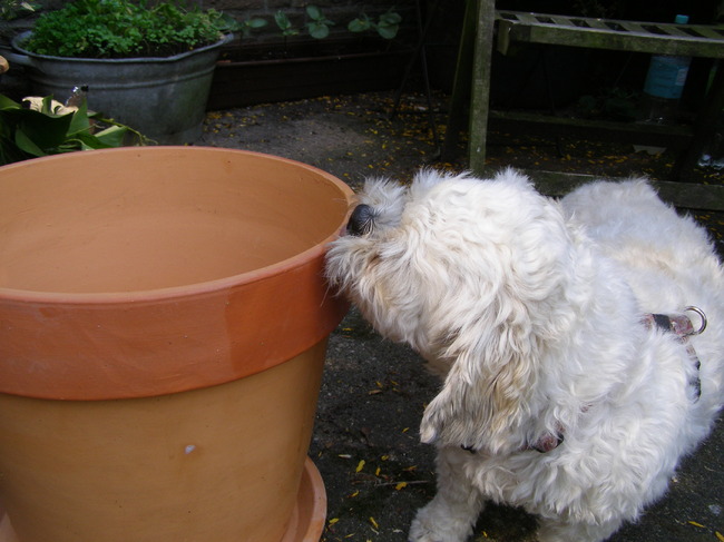 Deze pot was ingesmeerd met karnemelk zodat hij groen zou worden. De karnemelk bleef er alleen niet lang opzitten want Hazel vond het veels te lekker! van Lotte