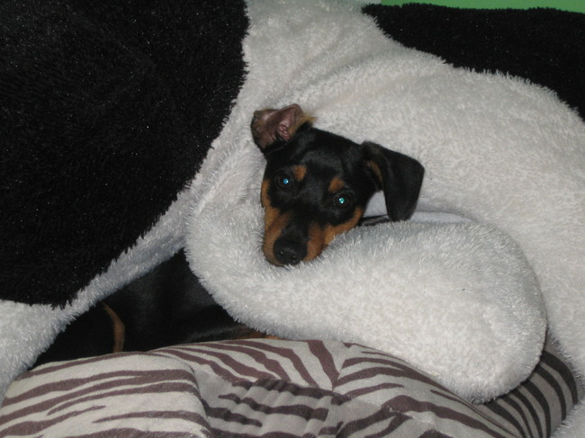 Zie hem lekker liggen tussen de grote knuffel! Natte likjes van Fancy