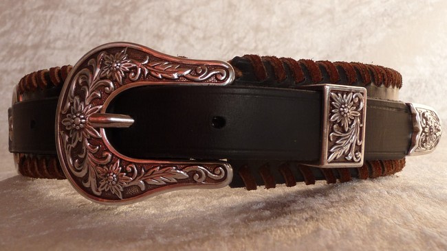 Zwart leren halsband met cognac kleurige suède veter en Sunburst buckle-set van Caroline Janssen-Hardam