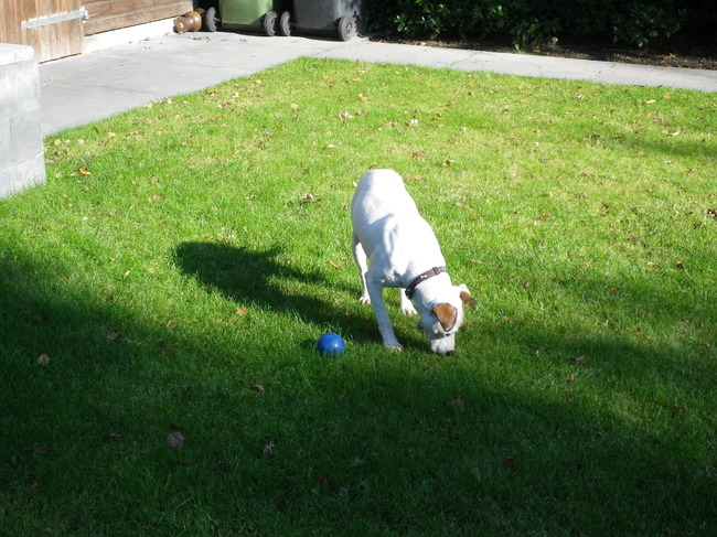 Honden foto's > Ria > Ook zoiets, noemen ze gras. Kun je eten, lekker! En die bal is voor MIJ.