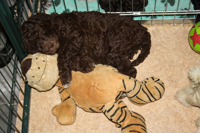 Honden foto's > Fam.Bos > Pup Mees met zijn knuffel, helemaal moe van de kijkdag.