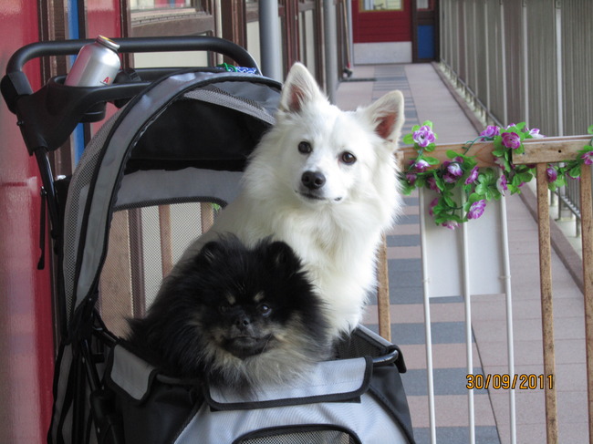 Honden foto's > Josien , Logan en Nikki > lOGAN EN nIKKI SAMEN IN DE BUGGY.