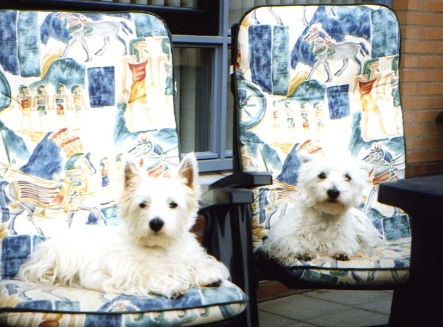 Honden foto's > Diane > Samen maar ieder een eigen tuin stoel.