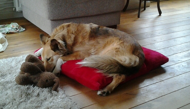 Honden foto's > Iris + Shira! en Bibi! > Nieuw kussen zelf gemaakt, opgekrult past het prima...