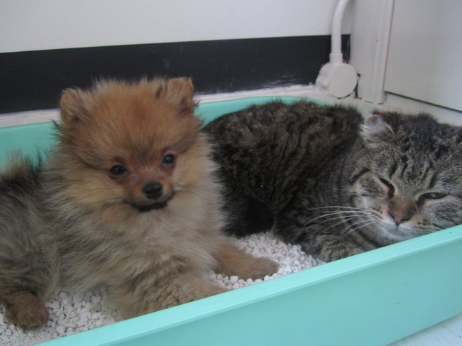 Honden foto's > Patricia > Met mijn nieuwe kattenvriend Bailey in de kattenbak.
