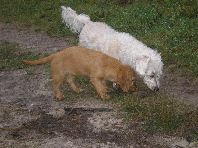 Honden foto's > . > samen snuffen aan het zelfde grassprietje