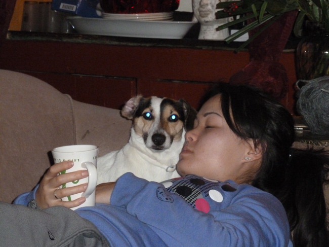 Honden foto's > Jin & Melo de tennisballenverzamelaar. > Met m'n vrouwtje op de bank slapen..