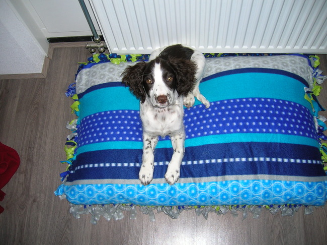 Honden foto's > Lisanne-Indy > Indy trots op haar nieuwe kussen