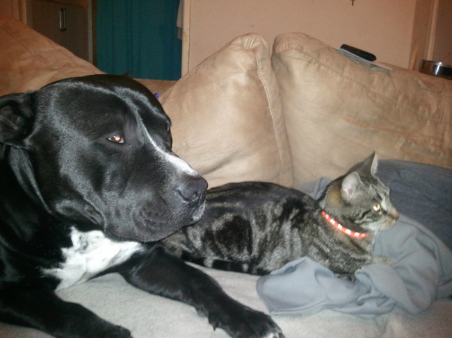 Honden foto's > Robert Bos > hier is hij al 1.6 jaar en 38 kilo maar nog altijd even goei vrienden met onze kat