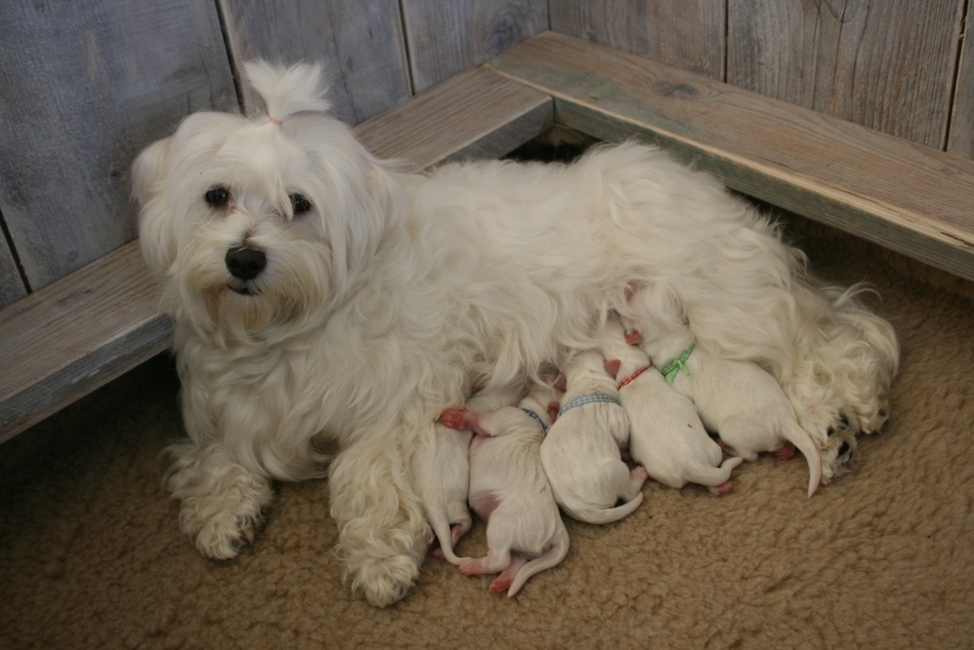 Moeder Amy met haar pups. Het pupje met het lichtblauwe bandje is Quincy van Gina Heuvelsland