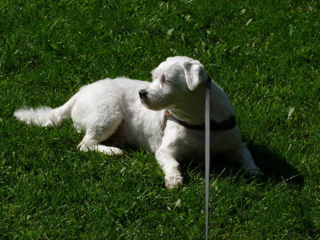 Honden foto's > Brokkel 3...De splinter in uw zitvlak! > Rob op het gras met een eendje in zijn gezichtsveld!