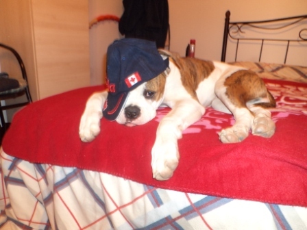 Honden foto's > Diesel > Dieseltje met Canadese pet (4 mnd oud)