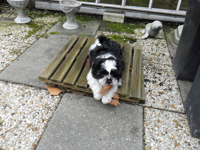 Honden foto's > Sonja&Marley > in de tuin aan het spelen met een blaadje