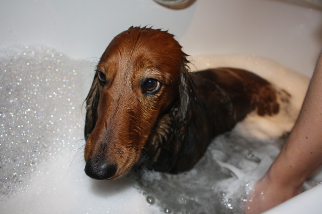 Honden foto's > Alice en Finn > Even lekker in bad...
