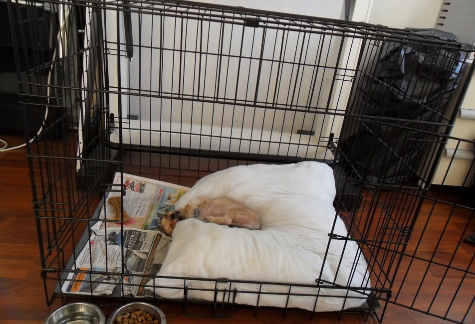 Honden foto's > Bonny en Puk > Pukje 10 weken oud sliep het liefste op deze manier...
