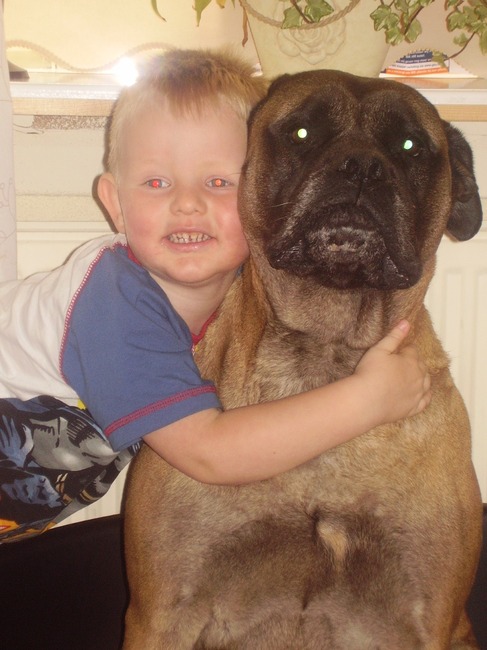 Honden foto's > Odin > hier sarah... onze bullmastiff die maar 8 jaar mocht worden, samen met mijn zoontje