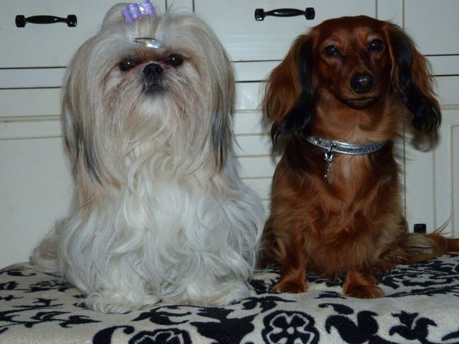 Honden foto's > Caroline > Rose, shih tzu. Pepper kaninchen langhaar teckel.