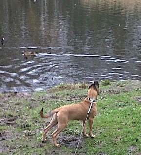 Honden foto's > Eveline > Ziva heeft de eendjes even het water in gejaagt