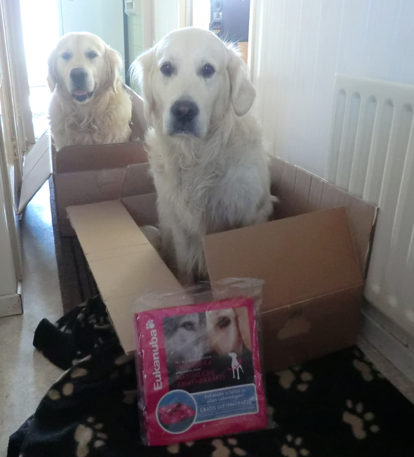 Honden foto's > Wil Schouten > Als het hondevoer wordt gebracht vinden ze het leuk om in de doos te gaan zitten.