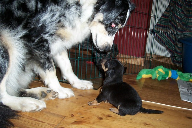 Honden foto's > texellen > JOY, Texellen Wind of Change snuffelt aan SUN, onze kleine black en tan JR