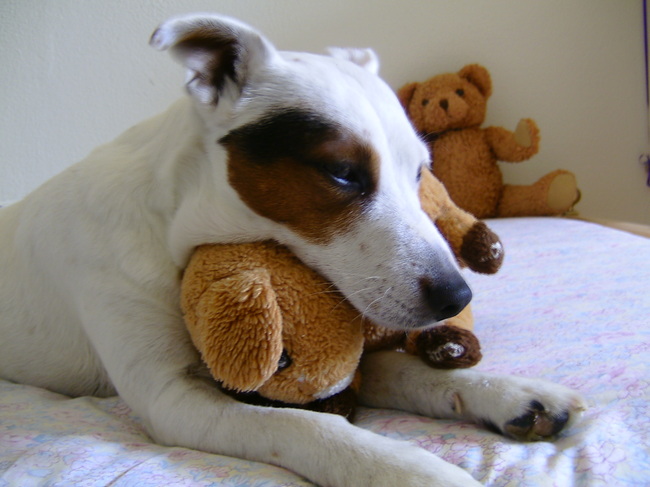 Lekker met knuffel Bambi op het bed, maar niet vertellen tegen de bazin dat ik de nek van Bambi heb vernield....shhhhhhhh van Maylo, Fudge en Ziko † en baasje Laura