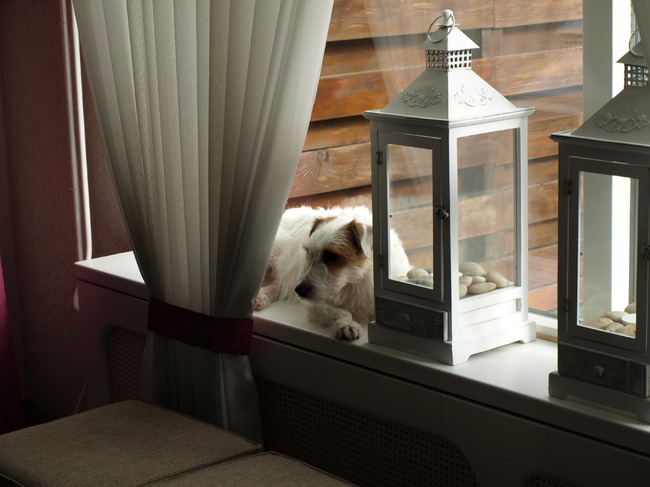 Honden foto's > Astrid & Schumi > Mijn nieuwe hobby, zonnen in de vensterbank