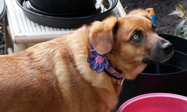 Honden foto's > Elahjenthodie > Elah met een zelfgemaakt bandje met bloem....sjattig he!!