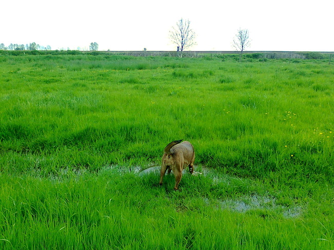 > Kylie, 7 mei 2012 : Weide met waterplassen na verse regen kan ook eens leuk zijn !