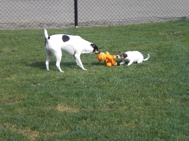 Honden foto's > Sanne & Denise, Fanny, Vita > Touwtrekken? Nee joh, knuffeltrekken is veel leuker!!
