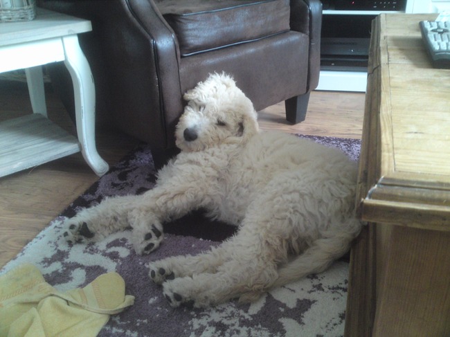 Honden foto's > Gerda en Labradoodle Bowie > Lekker lui(16 weken oud)