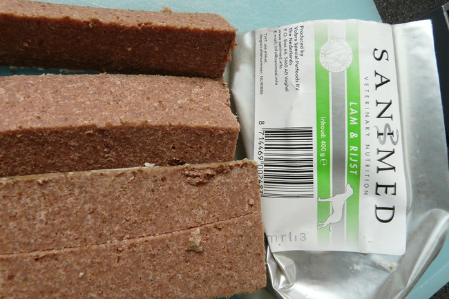 > Sanimed vleesworst van de DA 400 gram 3 euro. Voor hond van 10 kilo nodig 360-410 gram/dag