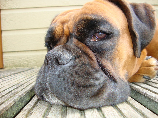 Honden foto's > Jonas > Tess ligt lekker te luieren op de veranda van ons chalet.