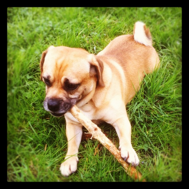 buiten aan het spelen met een stok ik ben gek op rennen en spelen van Mike en Ozzy