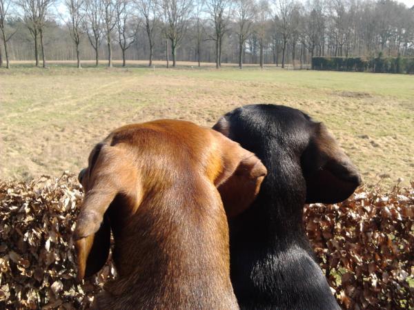 Honden foto's > Inge Sleijster/ Vink > Ukkie en Jopie kijken of er nog konijntjes lopen.