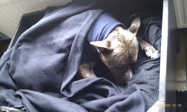 Honden foto's > Connie & Sam > Nog ff lekker slapen onder een dekentje om warm te blijven na de operatie.
