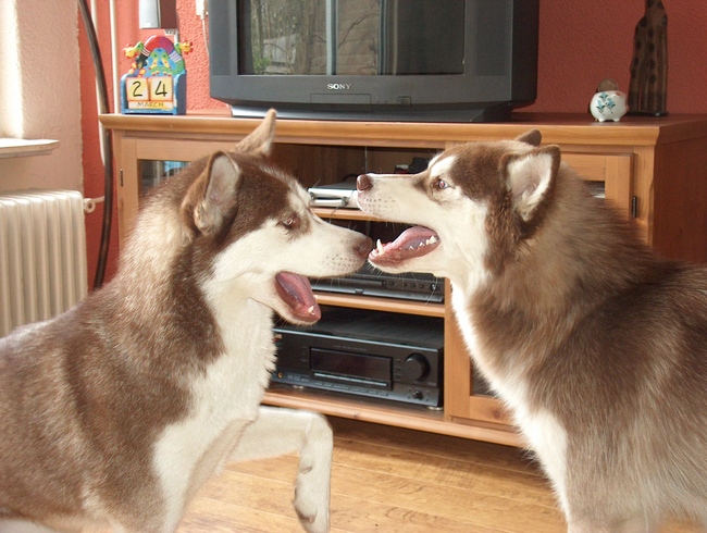 Honden foto's > joyce van Suka en Aiko > Suka met zijn zus Kaya in discusie