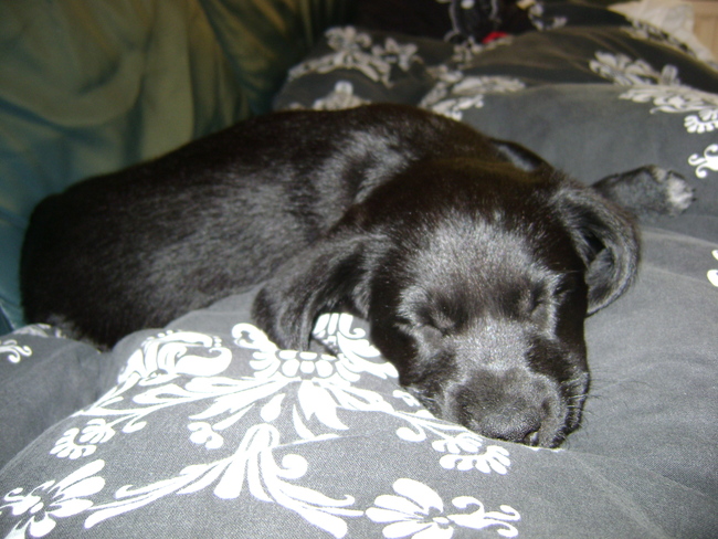 Honden foto's > Raphaela > dag 2 Lekker bij vrouwtje op de bank slapen.