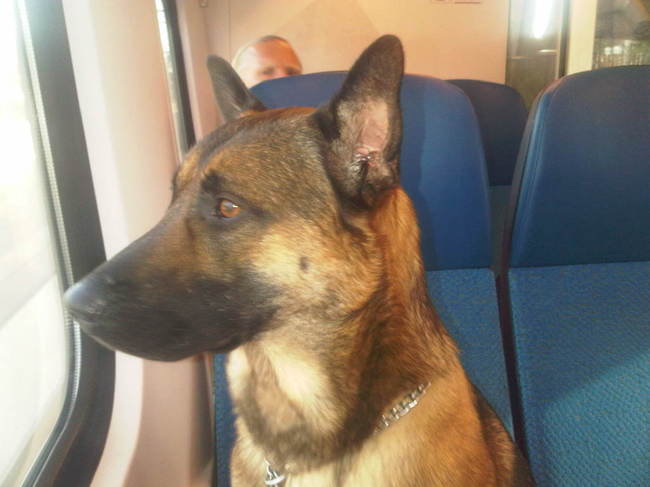 Honden foto's > Ton met mijn Mechelaars Lex en Nero > lekker in de trein met Lex