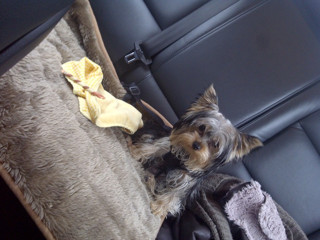 Honden foto's > Brigit > Indy op de achterbank (met riem!) van de auto, 6 mndn oud.
