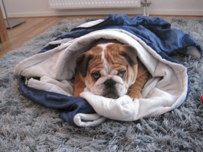 ik heb het koud! mijn deken houd me lekker warm! woef woef. van Vanessa.