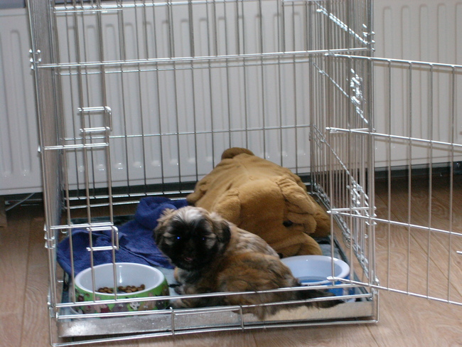 Honden foto's > Stephanie en Cash > Kijk eens vrouwtje ik zit in mijn bench (zijn 1e dag bij ons)