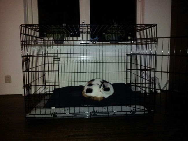 Honden foto's > Simone & Noah > De net binnengekregen bench is toch geen kraakpand..? Onze poes Punk vindt van wel.