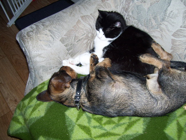 Honden foto's > Het Teckelventje.--Lobke Lodewijk en de rest. > vlaai bezig met opvoeden van lobke.