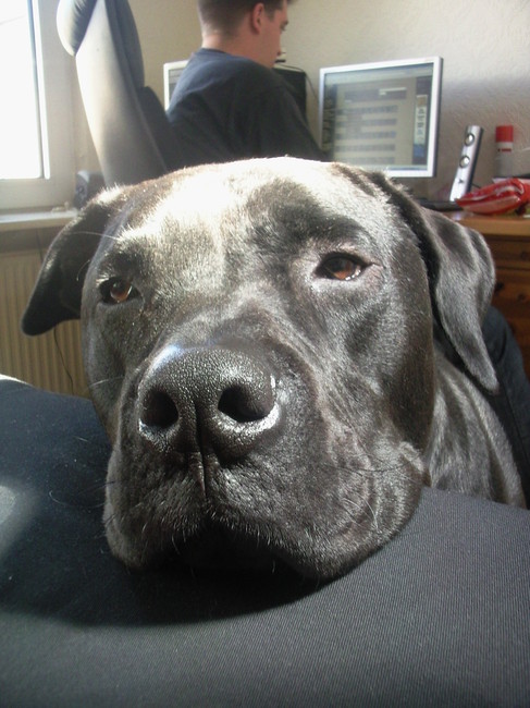 Hier wilde hij aandacht en legde daarom zijn hoofd op de leuning van de bank van Tessa