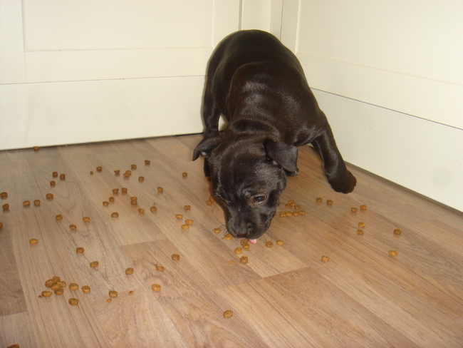 > Omdat ik zo inhalig at uit mijn bakje, moet het voorlopig even van de vloer zodat ik er niet meer in stik..
