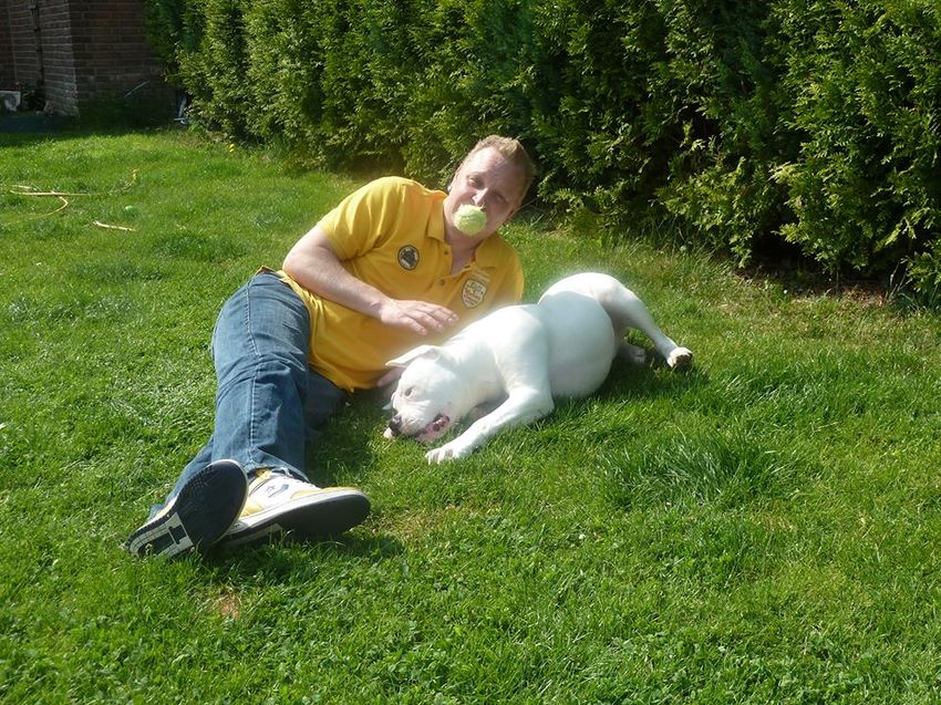 Danny, mijn zwager, die Mylo altijd verwent en waarvan hij heeft geleerd ballen te vangen. van Marjan. AmBull Club
